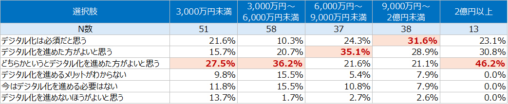 また、年商別に見ると、年商規模が大きくなるほどデジタル化を「必須」と捉える傾向が見て取れます。デジタル化に肯定的な回答(「必須だと思う」、「進めたほうがよいと思う」、「どちらかというと進めたほうがよいと思う」の合計)と否定的な回答(「メリットがわからない」、「今は進める必要はない」、「進めないほうがよいと思う」の合計)で分類すると、明確な傾向が見えてきます。