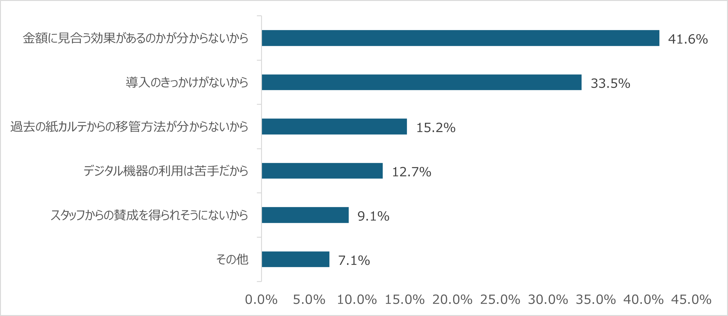 この結果は、導入を検討している層に対して「適切な情報」が届いていない可能性を示唆しています。先述の通り、紙のサブカルテを使い続けることで起きる問題は、経営に直結する問題になり得るのですが、それが十分に理解されていないことが見受けられます。もし、サブカルテのデジタル化によって解決できる問題が「物理的なスペース問題」だけと認識している場合は、費用対効果が見合わないと感じるでしょう。検討段階から一歩抜け出すには、先行して導入している層のように潜在している「経営に直結する問題」に自ら気づき、行動することが重要だと思われます。