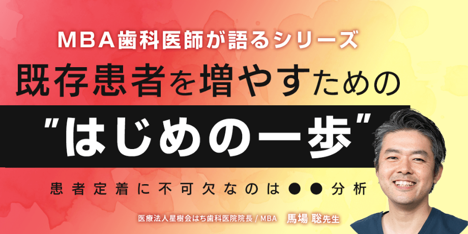 そこで本ウェビナーでは、究極の選択シリーズ第2回「新規患者を増やすべき vs 既存患者を増やすべき」の「既存患者を増やすべき」派を担当されたMBA歯科医師の馬場先生より「既存患者を増やすための”はじめの一歩”」についてお話いただきます。明日から使える分析や考え方のフレームをご紹介頂いておりますので、本ウェビナーをご視聴いただき、明日からの歯科医院経営の自信としていただけたらと思います。