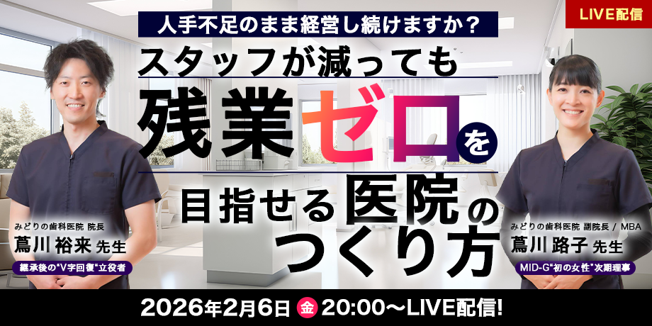 【2/6(金)20時~LIVE配信】人手不足のまま経営し続けますか?──スタッフが減っても”残業ゼロ”を目指せる医院のつくり方