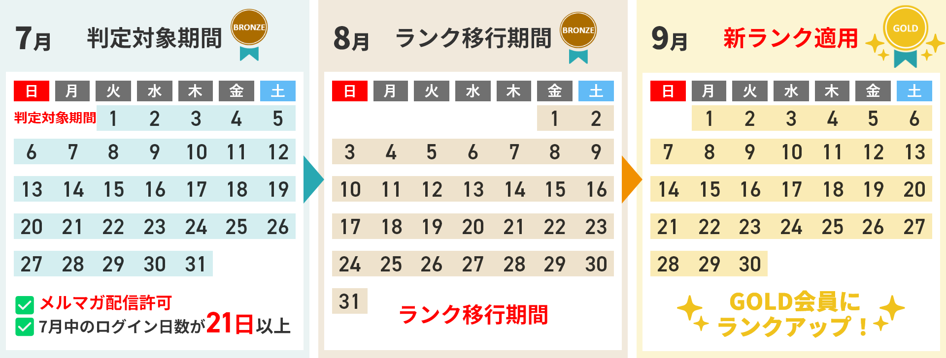 ランクの反映は、条件を達成した月の翌々月からとなります。